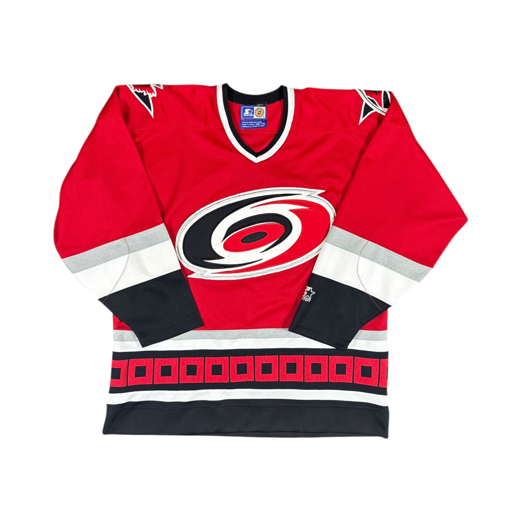 Worn by the Carolina Hurricanes during the 1997–99 seasons, this away jersey comes from the franchise’s early years after relocating from Hartford and becoming the Hurricanes. The squad featured key players such as Ron Francis, Keith Primeau, Glen Wesley, and Artūrs Irbe