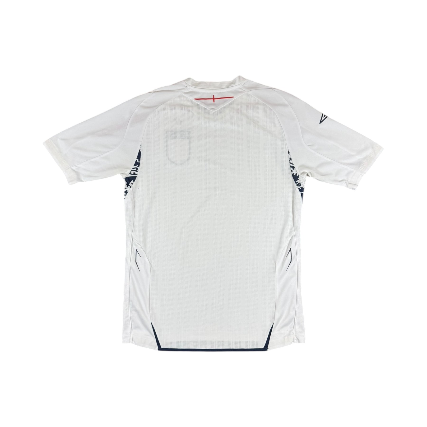 The 2007–09 England Umbro Home Shirt features the traditional white design with navy trim, worn during the qualification campaigns for Euro 2008 and the 2010 World Cup. Sported by stars like Wayne Rooney, Steven Gerrard, and Frank Lampard, this shirt represents England’s blend of experience and emerging talent under Steve McClaren and Fabio Capello.