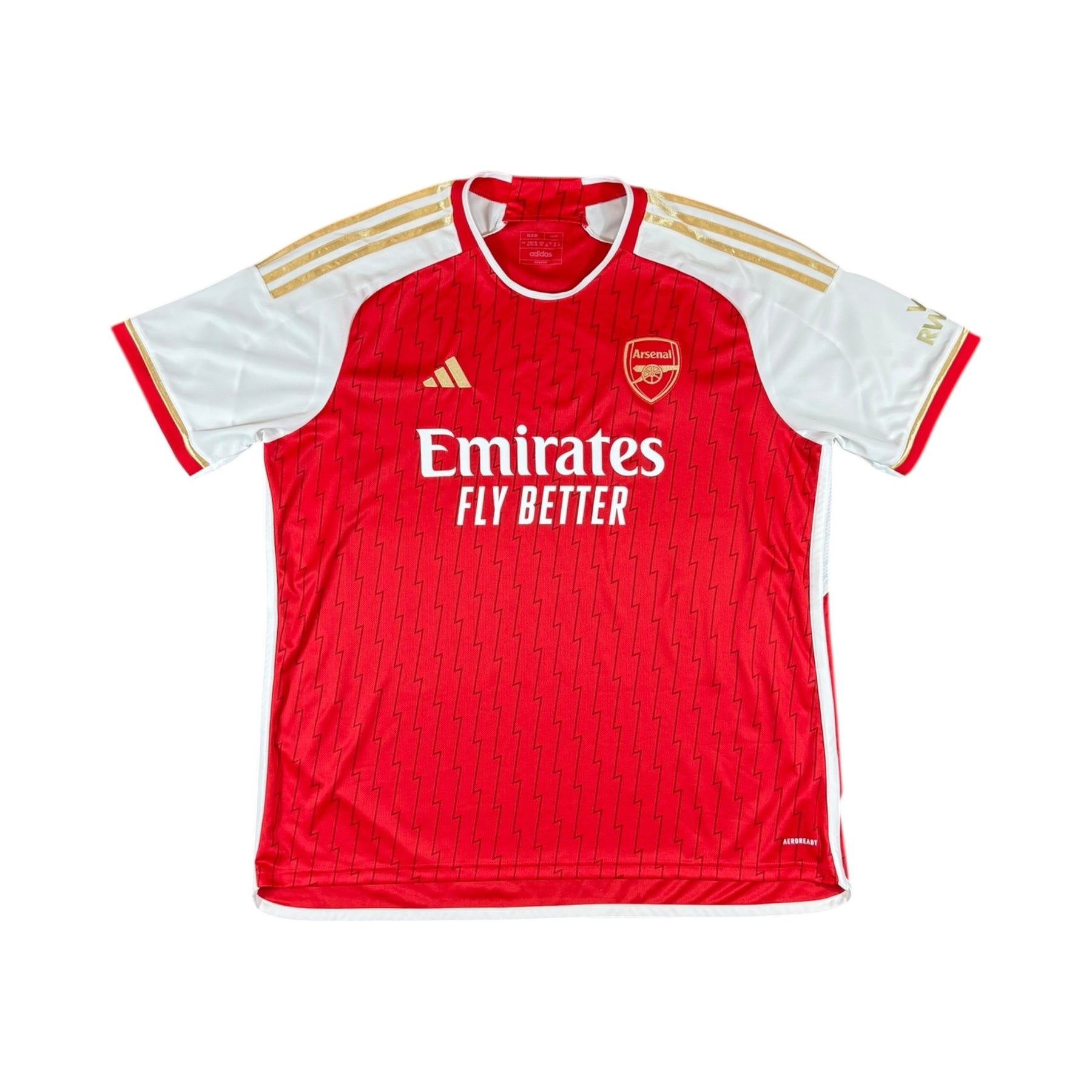 The 2023–24 Arsenal Adidas Home Shirt is worn during a season where Arsenal are competing at the top of the Premier League under Mikel Arteta, with key players including Bukayo Saka, Gabriel Jesus, Martin Ødegaard, William Saliba, and Aaron Ramsdale.