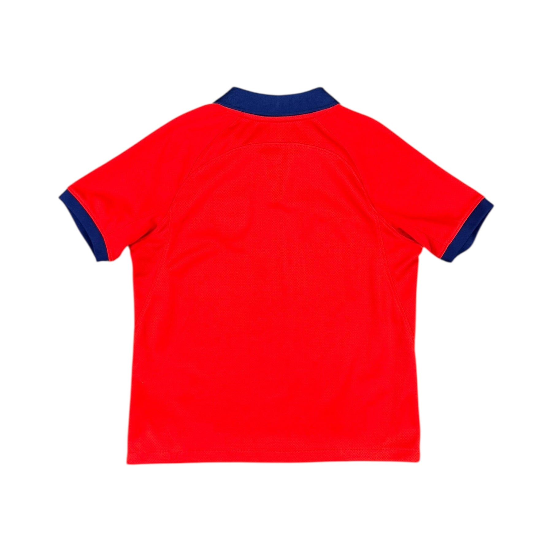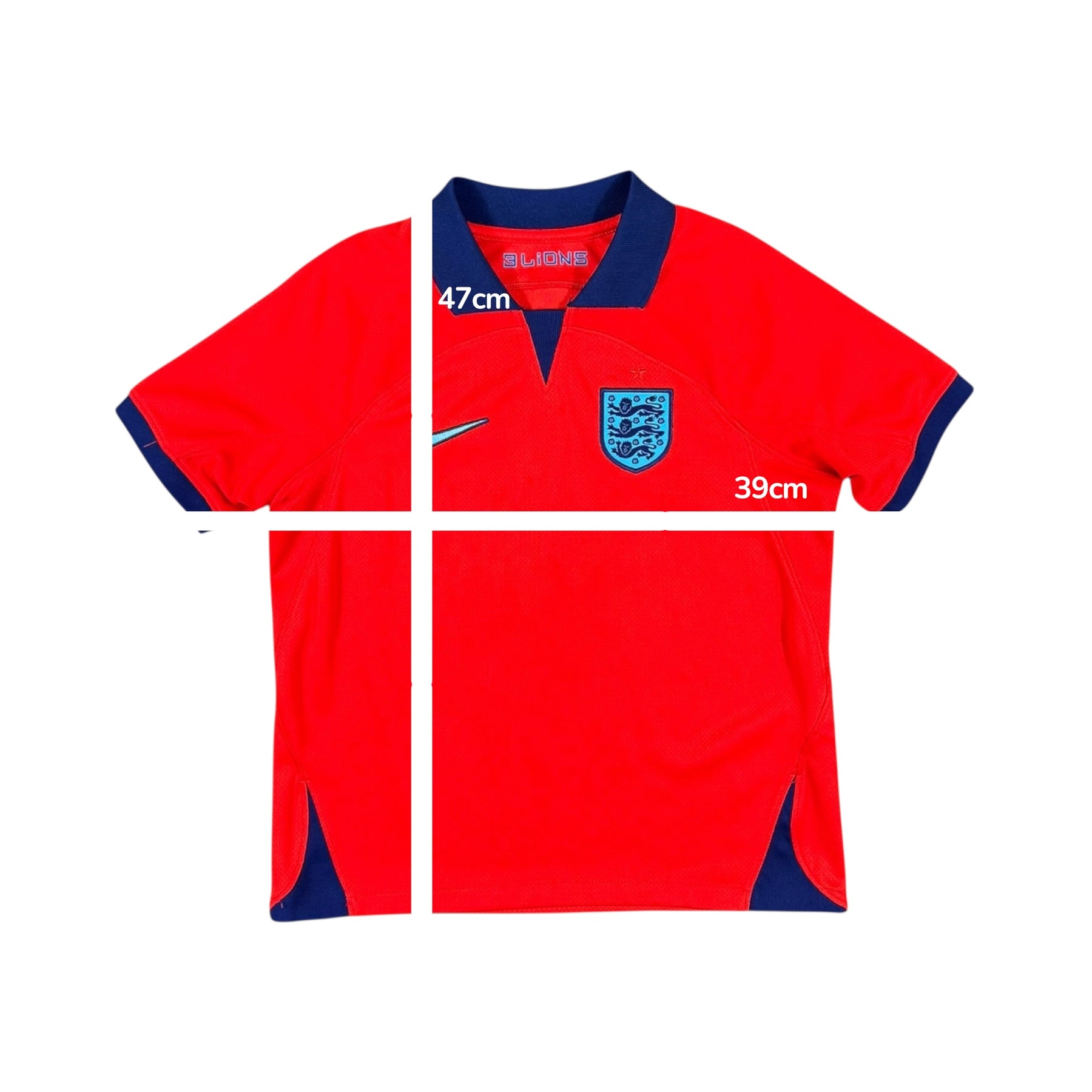 The 2022-23 England Nike Away Shirt brings back a bold, retro-inspired design for the Three Lions, featuring a striking bright red base with dark blue collar and trim, reminiscent of classic England kits from the 1990s. Worn by stars such as Harry Kane, Bukayo Saka, Jude Bellingham, Phil Foden, and Marcus Rashford, this shirt was part of England’s memorable 2022 FIFA World Cup campaign in Qatar, where the team showcased attacking flair and youthful energy under Gareth Southgate.