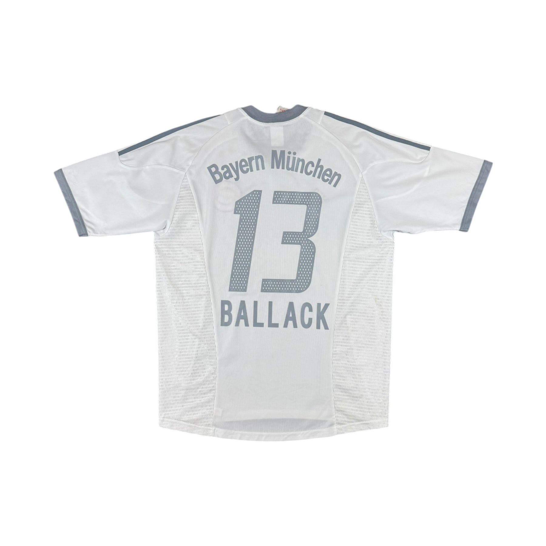 The 2002–03 Bayern Munich Adidas Away Shirt #13 Ballack was worn by Michael Ballack, alongside key teammates such as Oliver Kahn, Roy Makaay, and Claudio Pizarro, during a period in which Bayern Munich competed at the top of the Bundesliga and in the UEFA Champions League, finishing as Bundesliga runners-up and reaching the latter stages in Europe. Ballack was the driving force in midfield, providing leadership, creativity, and goal-scoring prowess.