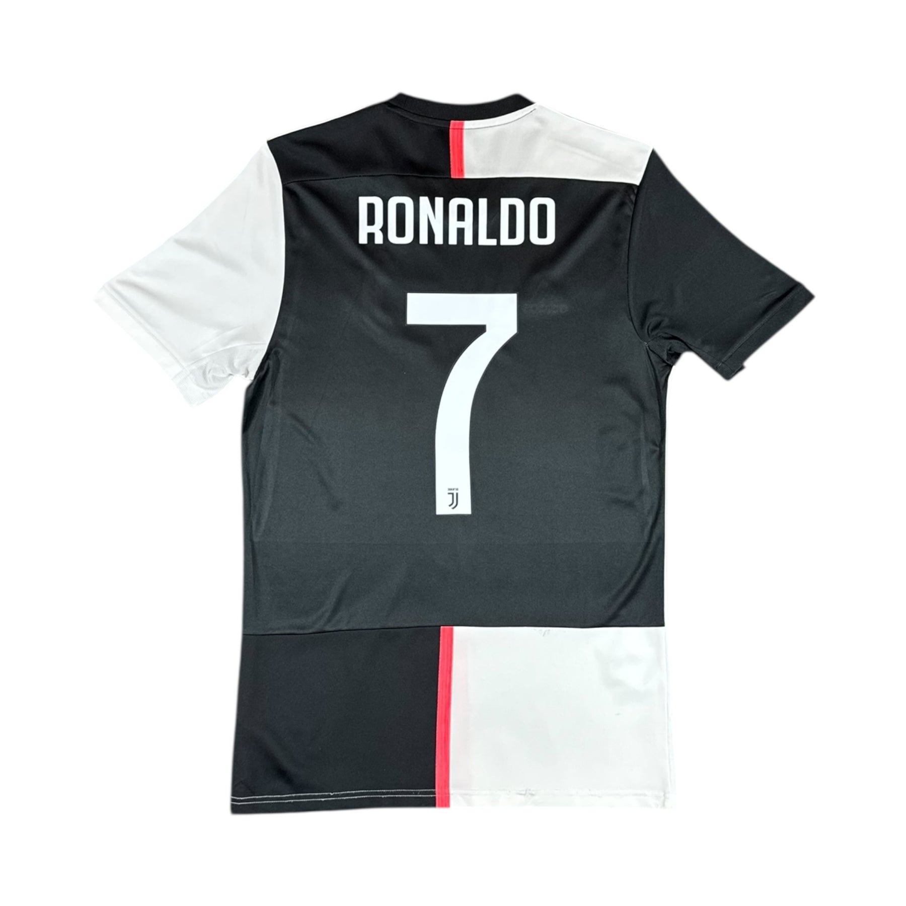 The 2019–20 Juventus Adidas Home Shirt stands out as one of the club’s boldest designs splitting the traditional black and white stripes into a half-and-half layout with a pink accent through the centre. With printed Cristiano Ronaldo (#7) during his second season in Turin, this shirt represents a campaign where the Portuguese superstar led Juve to another Serie A title, scoring decisive goals and showcasing his trademark brilliance.