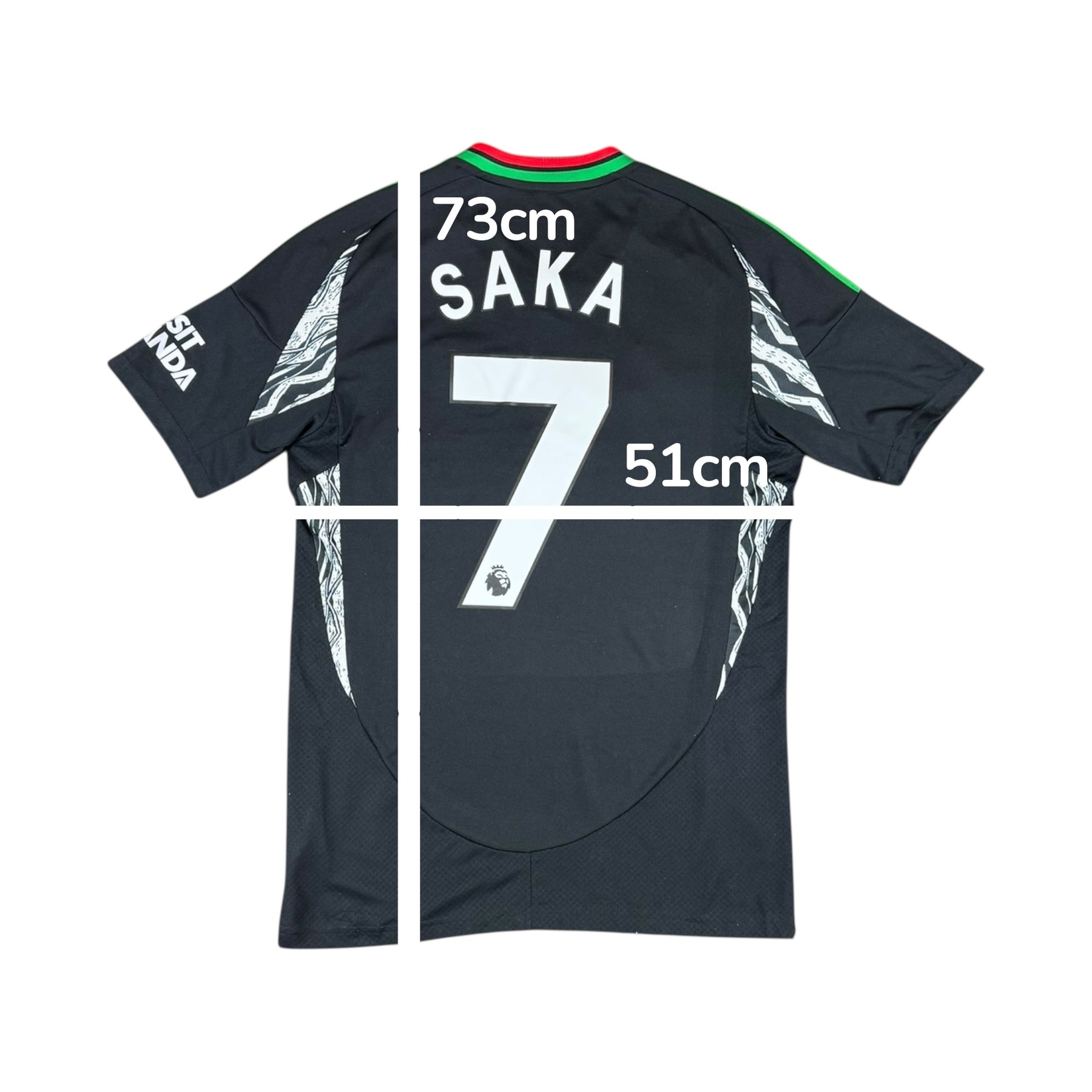 The 2024–25 Arsenal Adidas Away Shirt #7 Saka is worn by Bukayo Saka, alongside key teammates such as Gabriel Martinelli, Thomas Partey, and William Saliba, during a period in which Arsenal compete at the top of the Premier League and in European competitions. Saka has established himself as a pivotal figure for both club and country, combining creativity, pace, and goal-scoring ability to lead Arsenal’s attacking play.