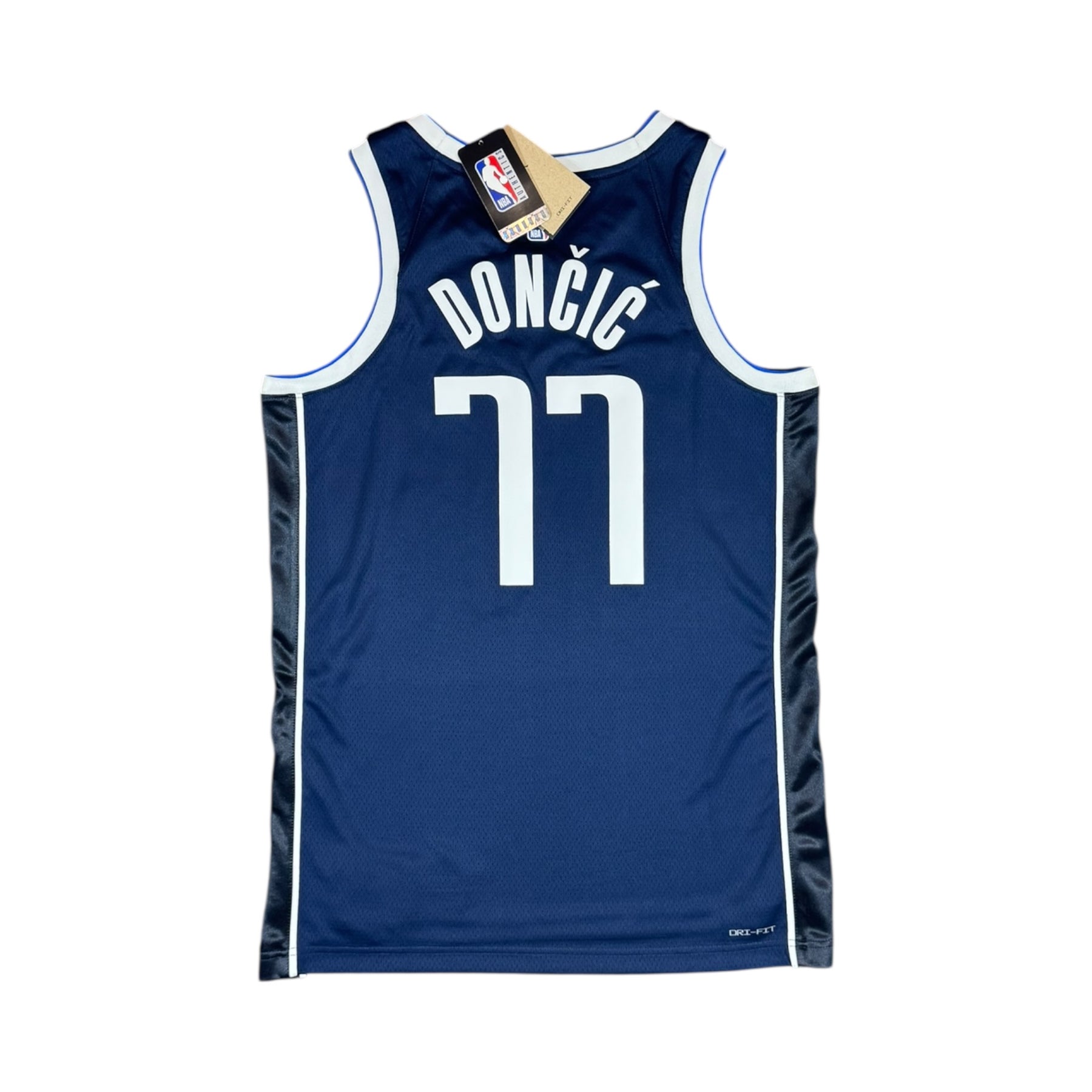 The 2022–24 Dallas Mavericks Nike Basketball Jersey #77 DONCIC, worn by superstar Luka Dončić. Featuring the Mavericks’ iconic blue and white design, this jersey represents a season where Dallas competed at the top of the NBA Western Conference, with Dončić leading the team with standout performances and clutch play
