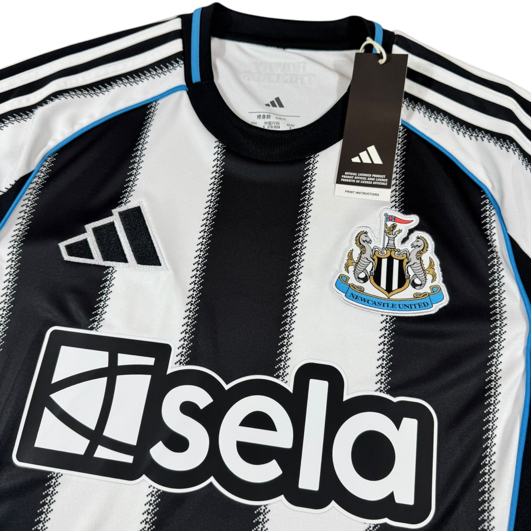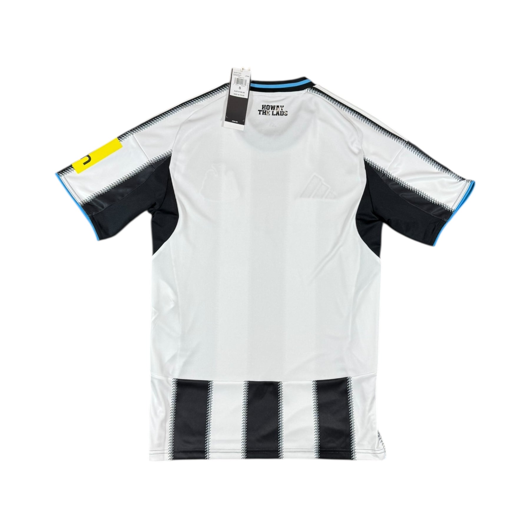 Designed by Adidas, this season’s home shirt gives Newcastle’s iconic black and white stripes a fresh twist by incorporating a subtle shepherd’s check pattern woven into the stripes, paying homage to regional heritage while maintaining the club’s classic identity.