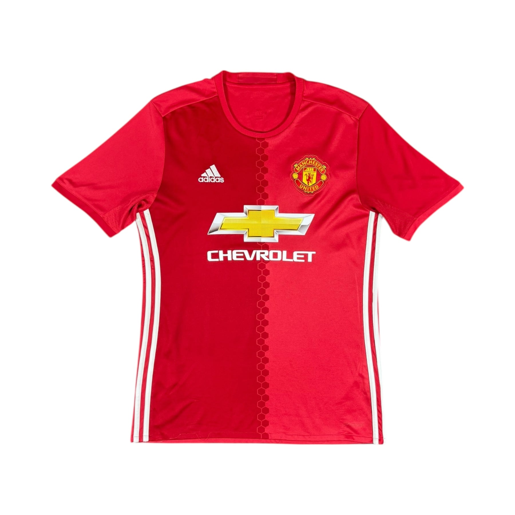 The 2016–17 Manchester United Adidas Home Shirt #9 IBRAHIMOVIC features a bold red design with a split-tone front panel and classic white trim, marking the beginning of a new era under Adidas and José Mourinho. Printed with Zlatan Ibrahimović during his debut season at Old Trafford, this shirt is forever linked with his incredible impact scoring 28 goals and leading United to victory in the EFL Cup and UEFA Europa League. His confidence, flair, and winning mentality made him an instant fan favourite.