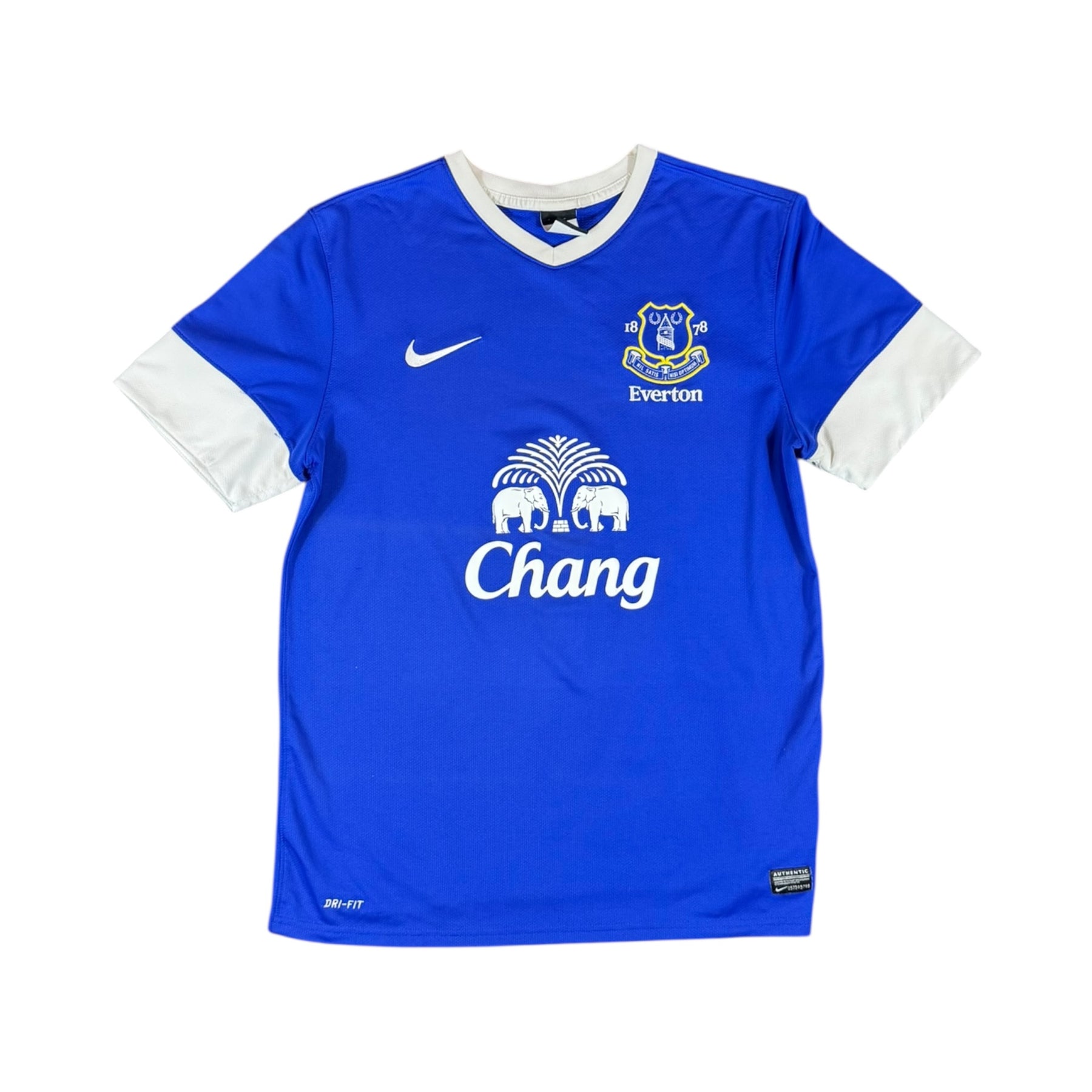 The 2012–13 Everton Nike Home Shirt features the club’s classic royal blue design with subtle tonal accents and was worn by key players such as Leighton Baines, Tim Cahill, Marouane Fellaini, Seamus Coleman, and Steven Naismith during a season where Everton finished 6th in the Premier League and competed in domestic cups