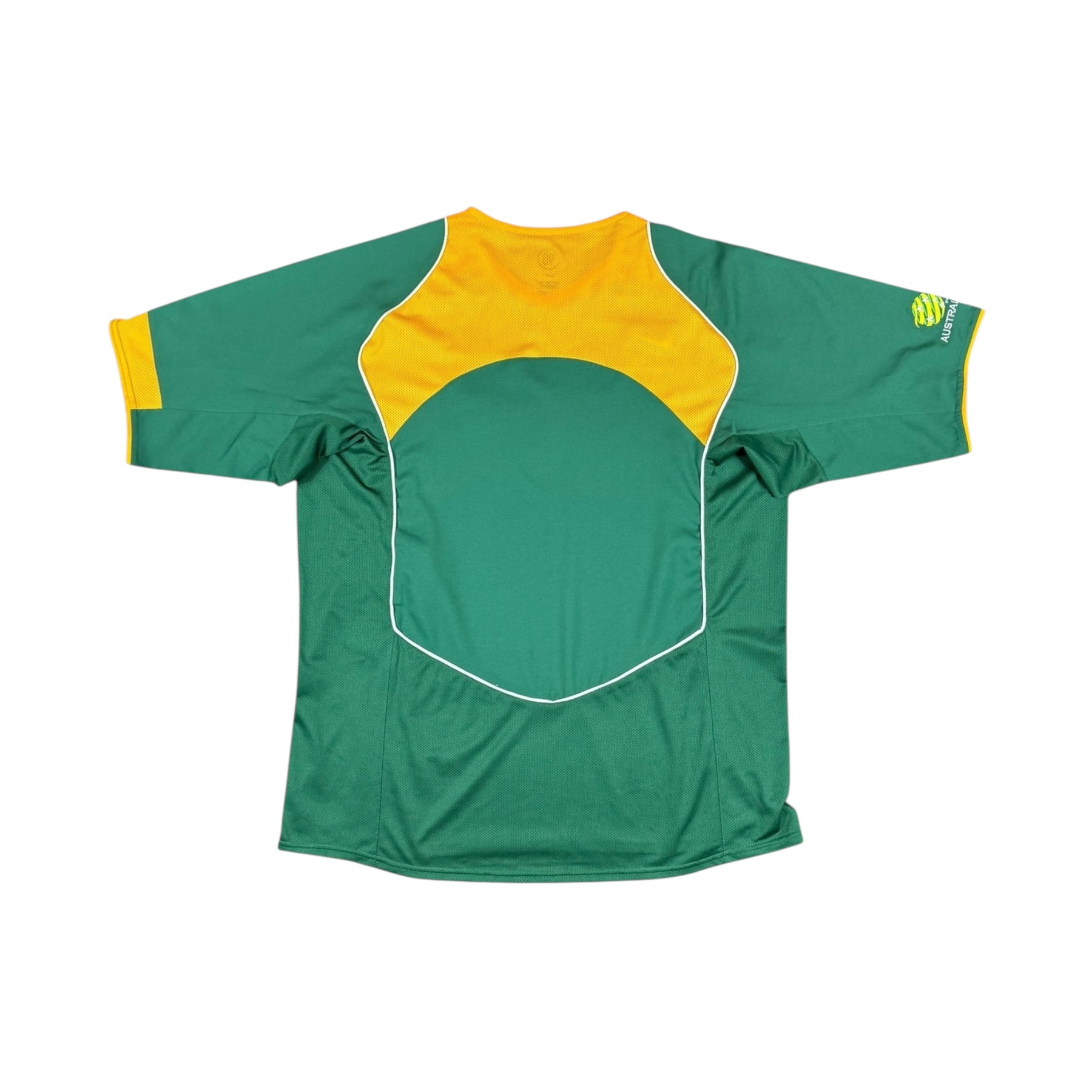 The 2004–05 Australia Nike T90 Away Shirt is a classic piece from the Socceroos’ golden era, featuring the sleek green design with gold detailing that defined Australia’s road to the 2006 FIFA World Cup. Part of Nike’s iconic Total 90 range, this shirt blends early-2000s performance tech with timeless retro style. Worn by legends such as Harry Kewell, Mark Viduka, Tim Cahill, and Brett Emerton.