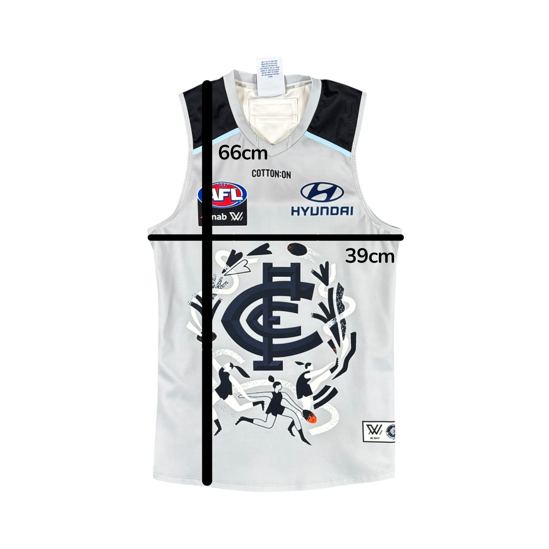 Issued to the Carlton AFLW squad for the Indigenous Round during the 2019–20 AFLW season, this match issue spare jersey celebrates Aboriginal and Torres Strait Islander culture through its unique design. The season saw Carlton reach the AFLW Grand Final, with the squad featuring key players such as Brianna Davey, Darcy Vescio, Katie Loynes, and Ebony Marinoff