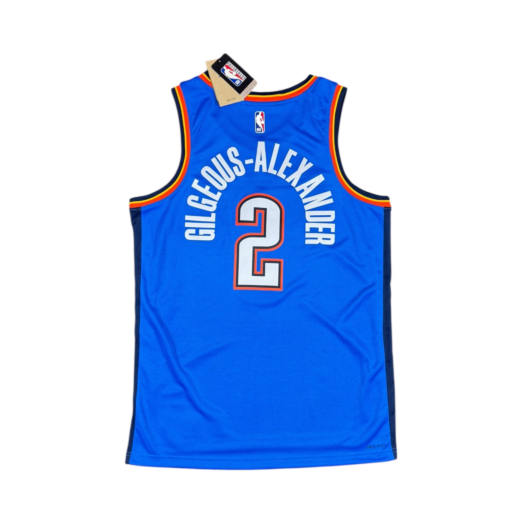 The 2023–24 Oklahoma City Thunder Nike Basketball Jersey #2 GILGEOUS-ALEXANDER, worn by star guard Shai Gilgeous-Alexander. Featuring the team’s modern city-inspired design, this jersey represents a season where Oklahoma City competed strongly in the NBA Western Conference, with Gilgeous-Alexander continuing to establish himself as one of the league’s premier talents.