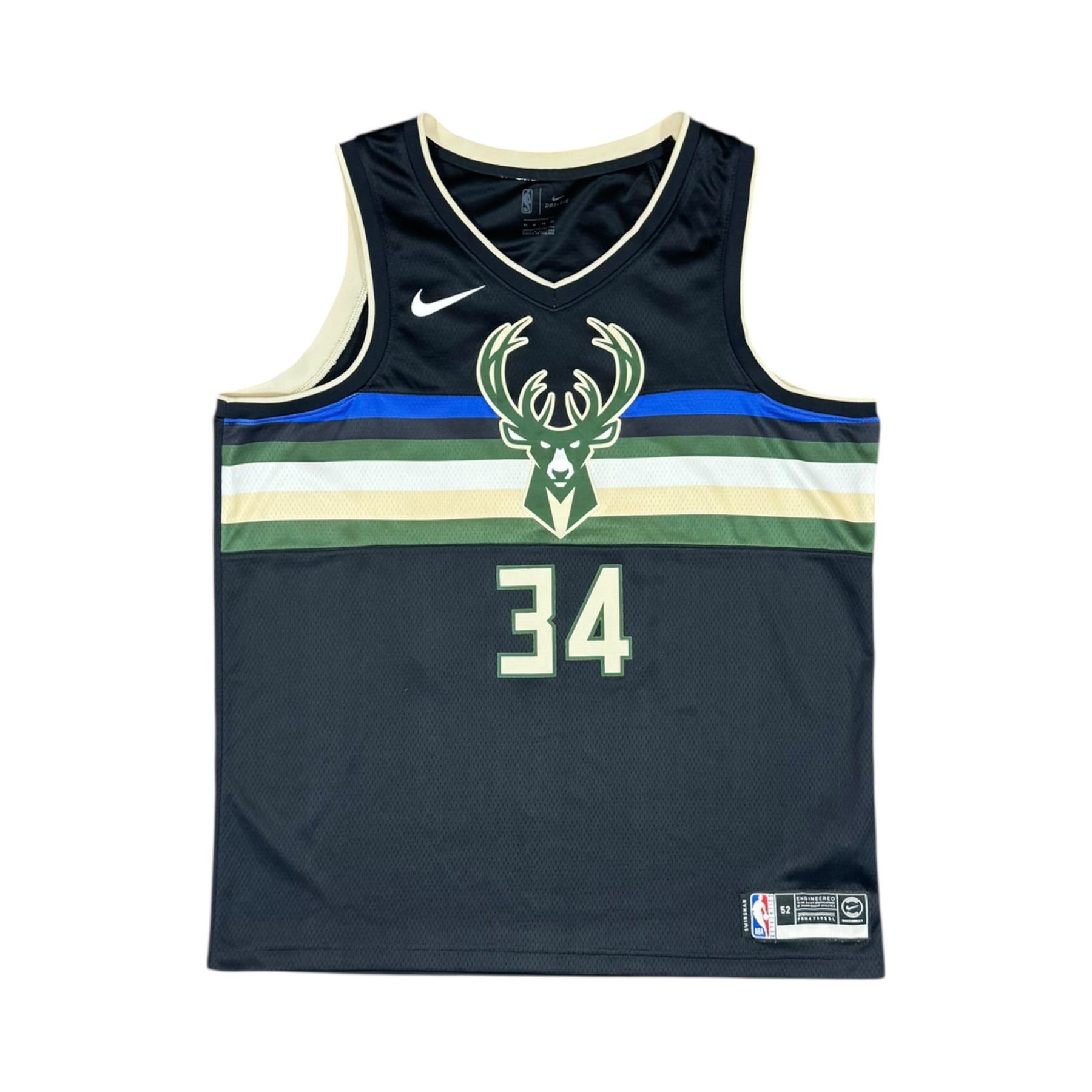 The 2024 Milwaukee Bucks Nike Basketball Jersey #34 ANTETOKOUNMPO, worn by superstar Giannis Antetokounmpo. Featuring the Bucks’ modern cream-and-green design, this jersey represents a season where Milwaukee competed at the top of the NBA Eastern Conference, with Antetokounmpo leading the team with dominant scoring, defense, and all-around play.