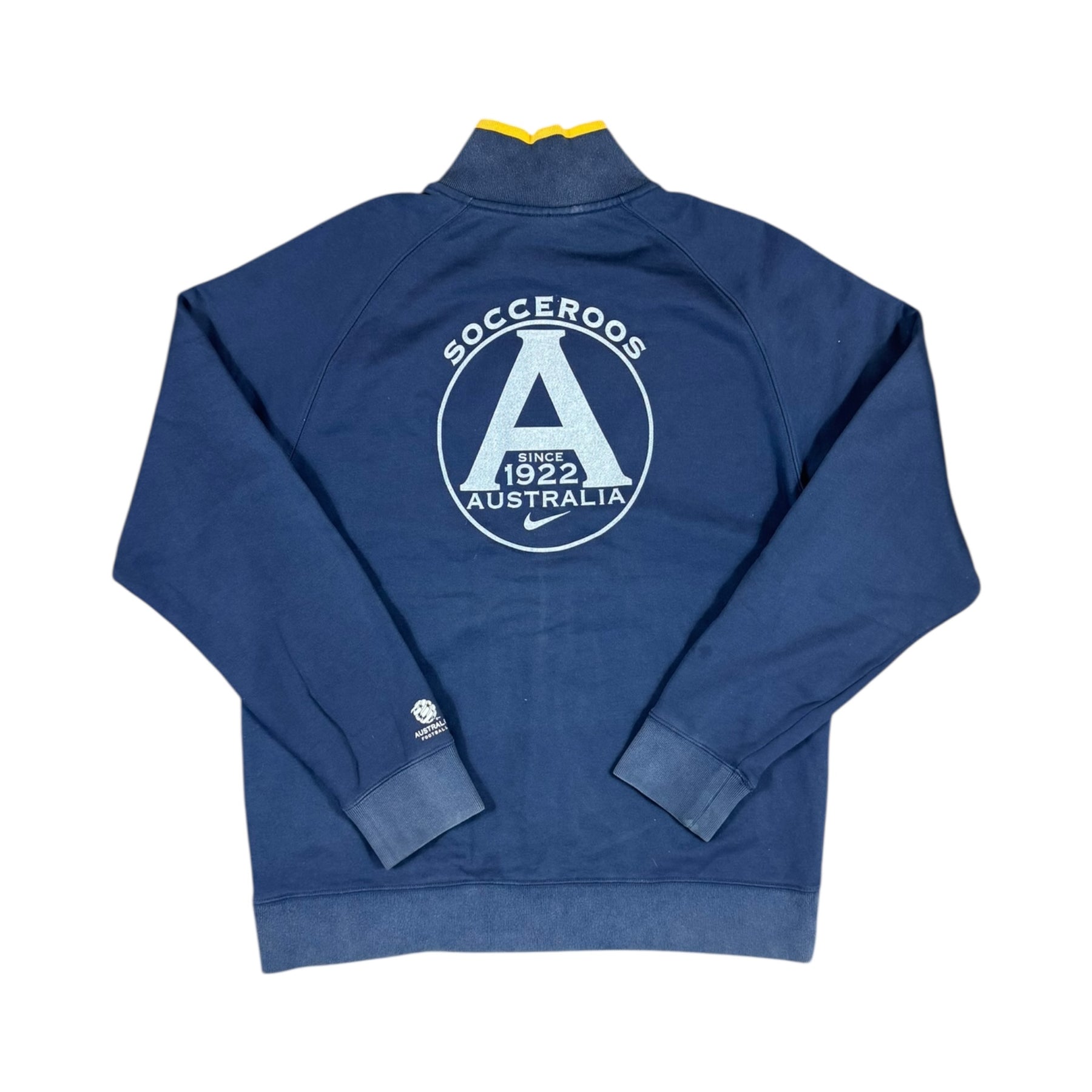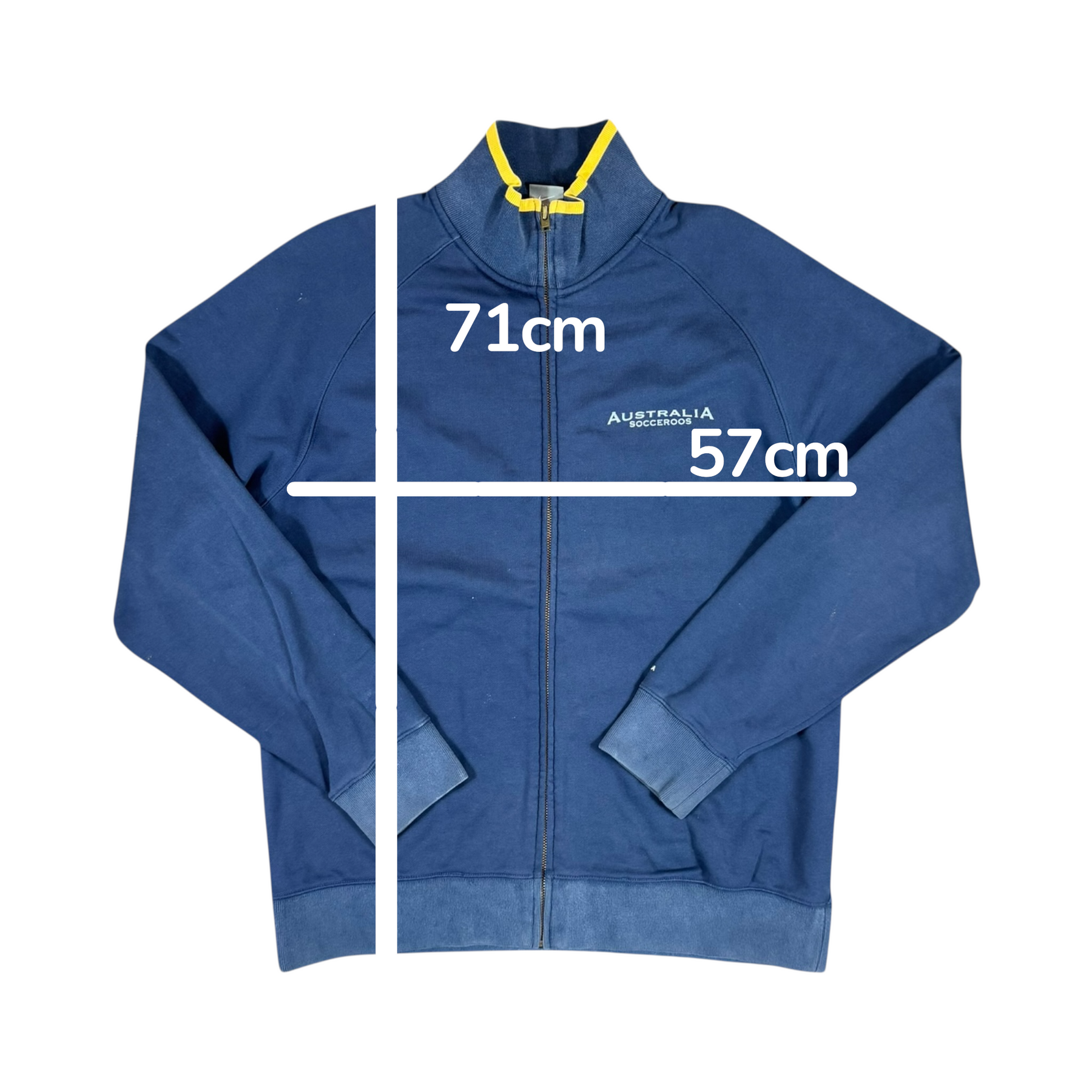 Worn by the Australia national football team during the 2003–05 period, this track jacket comes from campaigns including 2006 FIFA World Cup qualifying, where the Socceroos secured their place at the tournament for the first time since 1974. The squad featured key players such as Mark Viduka, Harry Kewell, Tim Cahill, and Mark Schwarzer