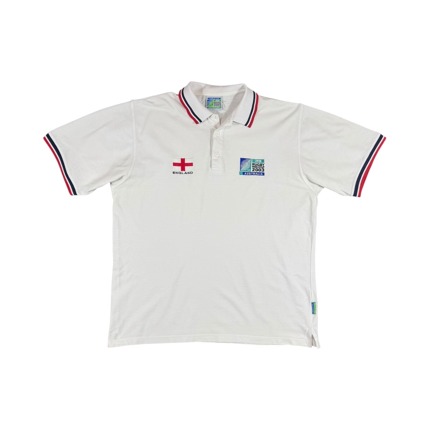 Worn by the England national rugby union team during the 2003 Rugby World Cup, this polo shirt comes from a historic campaign where England won the Rugby World Cup, defeating Australia in the final. The squad featured legendary players such as Jonny Wilkinson, Martin Johnson, Lawrence Dallaglio, and Jason Robinson