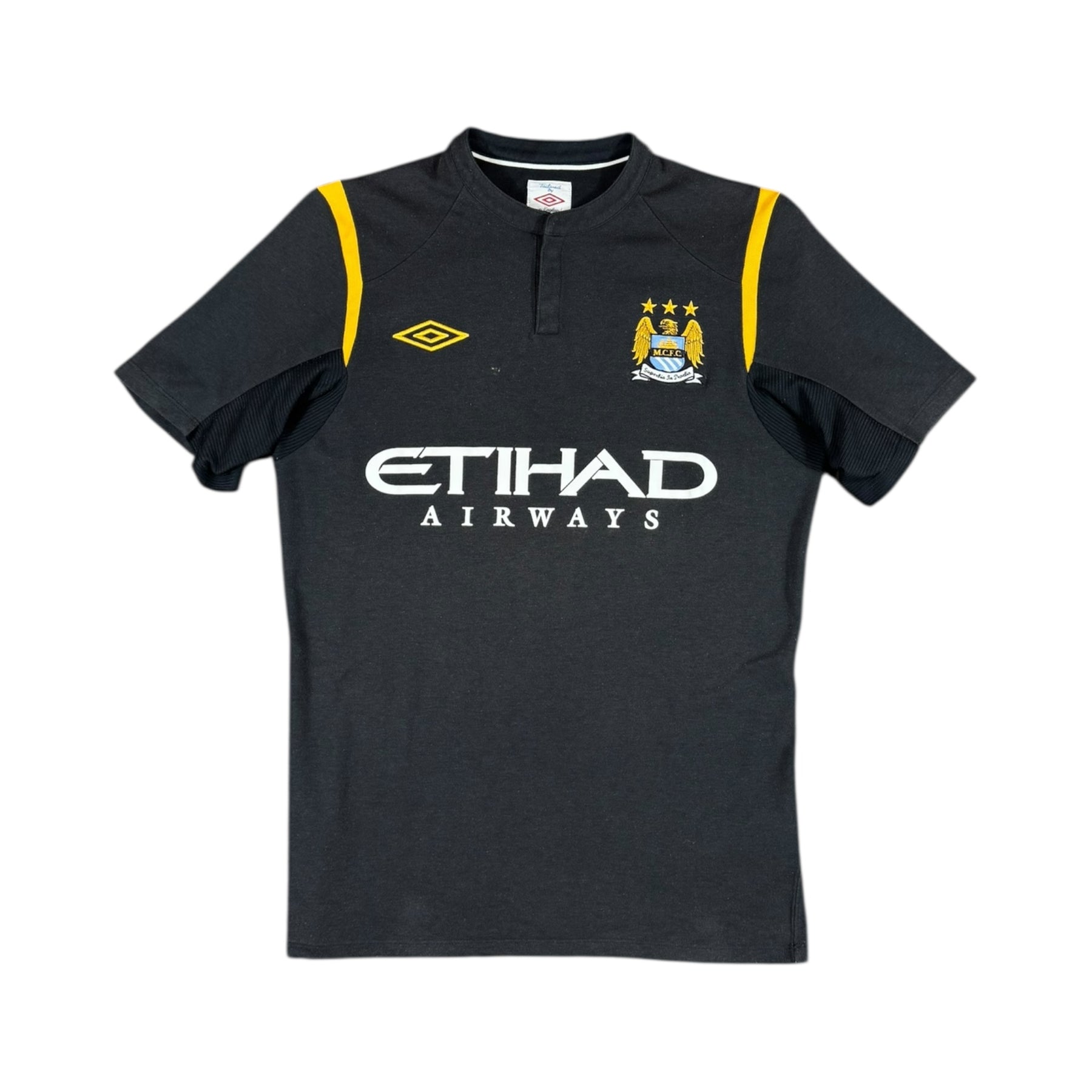 The 2009–10 Manchester City Umbro Away Shirt features a striking black design with yellow accents, offering a bold alternative to the club’s traditional home colours. Worn by key players such as Carlos Tevez, Vincent Kompany, and Micah Richards, this shirt represents Manchester City’s competitive campaigns in domestic and cup competitions during the season.