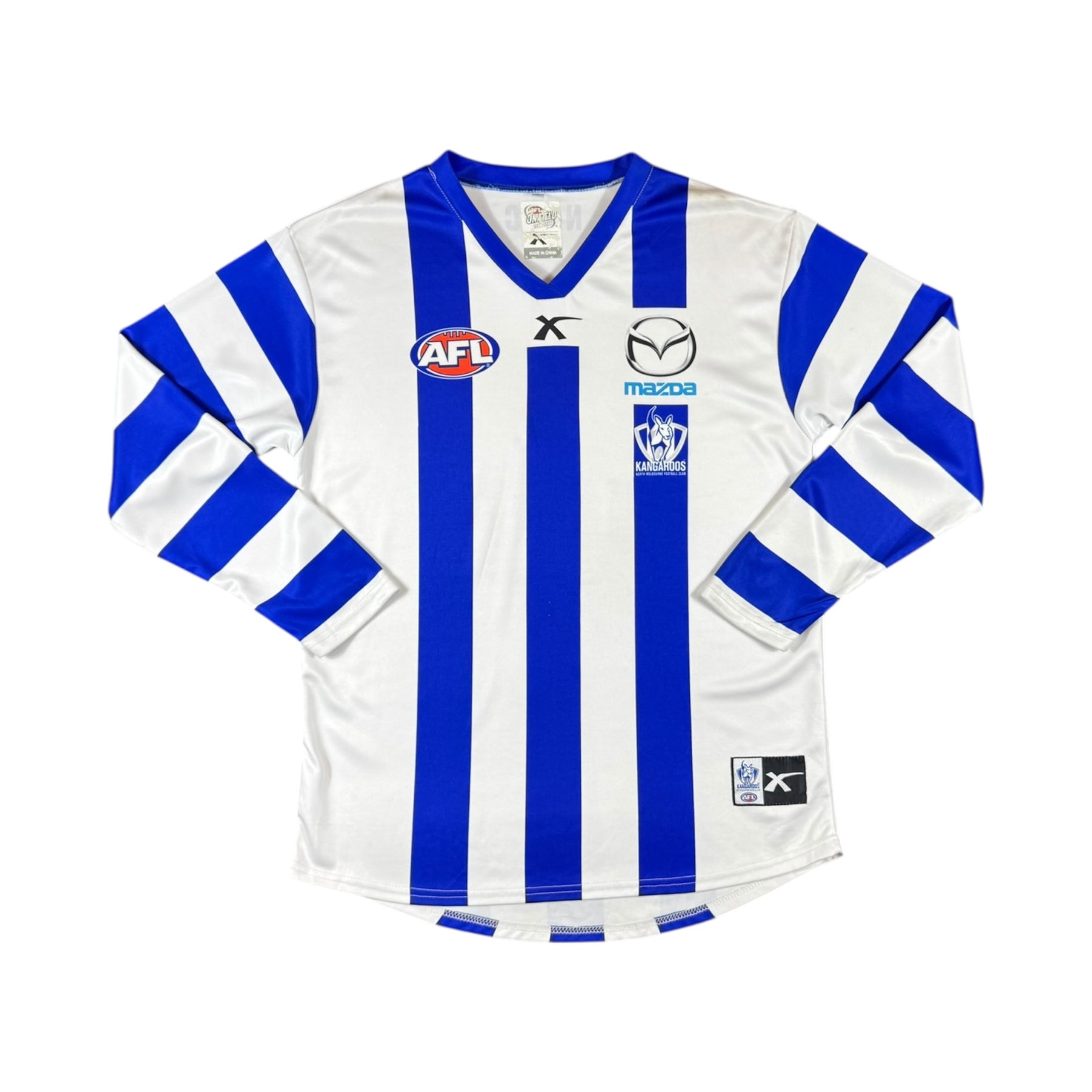 The 2011 North Melbourne Longsleeve AFL Home Shirt was worn by key players such as Brent Harvey, Drew Petrie, Andrew Swallow, and Daniel Wells during the AFL season. Featuring the classic royal blue and white stripes, this shirt represents the Kangaroos’ tradition, determination, and proud North Melbourne spirit.