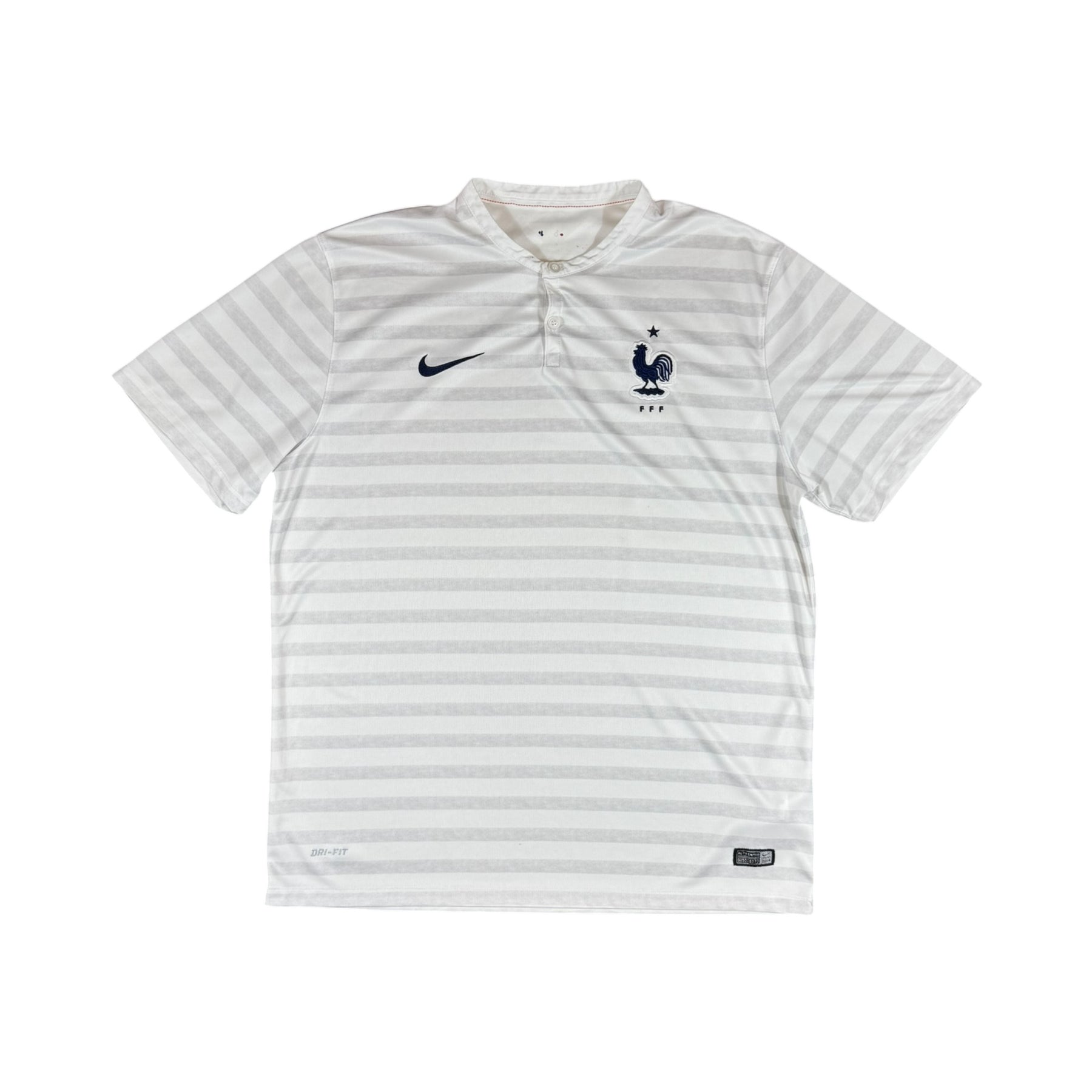 Worn by the France national football team during the 2014–15 period, this away shirt comes from campaigns including UEFA Euro 2016 qualifying and international friendlies. The squad featured key players such as Franck Ribéry, Antoine Griezmann, Paul Pogba, Hugo Lloris, and Raphaël Varane